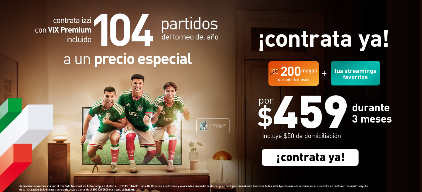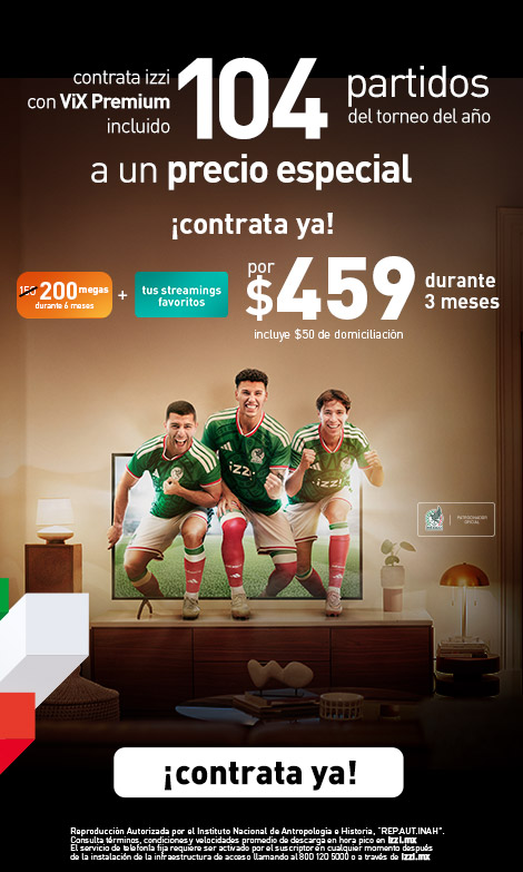 ViX Premium incluido durante 12 meses. Consulta términos, condiciones y velocidades promedio de descarga en hora pico en izzi.mx. El servicio de telefonía fija requiere ser activado por el suscriptor en cualquier momento después de la instalación de la infraestructura de acceso llamando al 800 120 5000 o a través de izzi.mx.