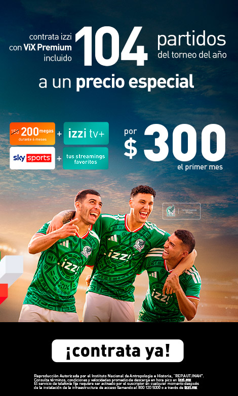 ViX Premium con Disney+ estándar con anuncios, HBO Max básico con anuncios y Apple tv incluidos durante 12 meses. Consulta términos, condiciones y velocidades promedio de descarga en hora pico en izzi.mx. El servicio de telefonía fija requiere ser activado por el suscriptor en cualquier momento después de la instalación de la infraestructura de acceso llamando al 800 120 5000 o a través de izzi.mx.